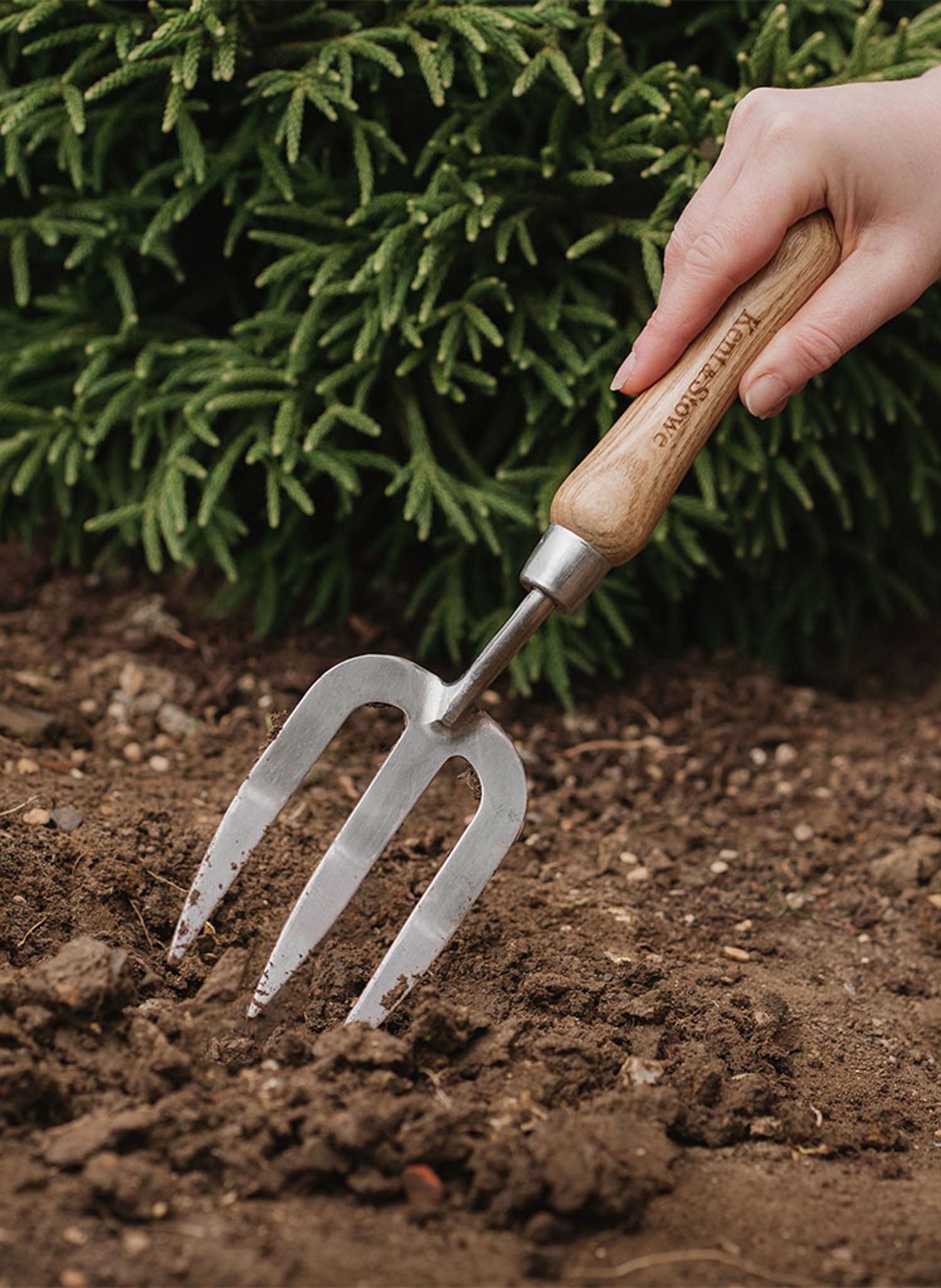 The Kent and Stowe Hand Fork is an essential garden tool. Designed with comfort in mind, it has a cranked shaft to protect knuckles during work. The stainless-steel head is rust resistant and minimises soil adhesion.